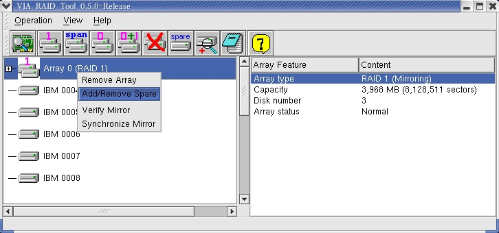 If the Mirror Array already has a Spare disk, the result of executing Add/Remove Spare command will have the Spare disk removed from the Mirror array. Message boxes will pop up to ask for removal confirmation and prompt system reboot. System must be rebooted to enable the newly removed Spare disk.