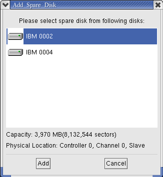 If the Mirror array has no Spare disk yet, an Add Spare Disk dialog will then appear: