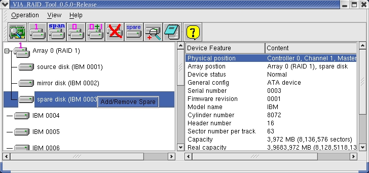 Spare disk is the auto-selected replacement disk when repairing a broken Mirror (RAID 1) array. Only Mirror array can have a Spare disk. A Spare disk can be added when Creating a Mirror array, it can also be added or removed after a Mirror array is created.