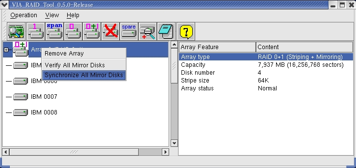 You can also right click the root node of a RAID1 or RAID0+1 array, then execute Synchronize Mirror or Synchronize All Mirror Disks from the shortcut menu, as following pictures show:
