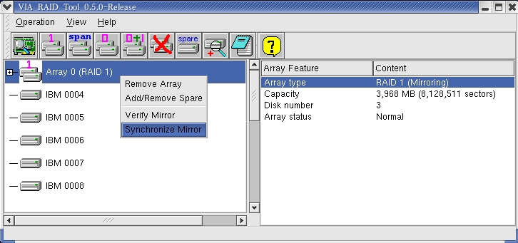 To synchronize a Mirror disk with corresponding Source disk, you can right click the Mirror disk in Array View, then click Synchronize Mirror on the shortcut menu, as following picture shows: