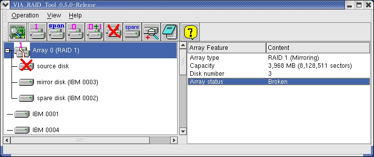 Disk Array and Device (mean Disk here) may have different status, such as warning, error, need sync, need reboot...etc. VIA RAID Tool uses various icons to imply these different status. Detail status information is displayed in right pane of the application window when a disk array or disk is selected in left pane, following is an example (a disk array with broken status):